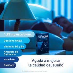 Complemento alimenticio con Melatonina, GABA, Vitaminas B3 y B6, extractos de Amapola de California, Valeriana y Pasiflora. Especialmente formulado para mejorar la calidad del sueño2 gracias a su contenido en Amapola de California y aborda las distintas dificultades del sueño: conciliación1, mantenimiento5 y ajuste horario3, favoreciendo un descanso nocturno saludable6.