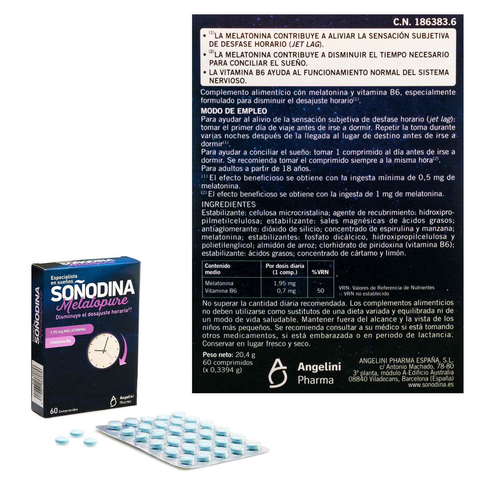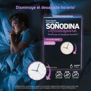 Soñodina Melatopure es un complemento alimenticio con melatonina y vitamina B6 especialmente formulado para disminuir el desajuste horario.